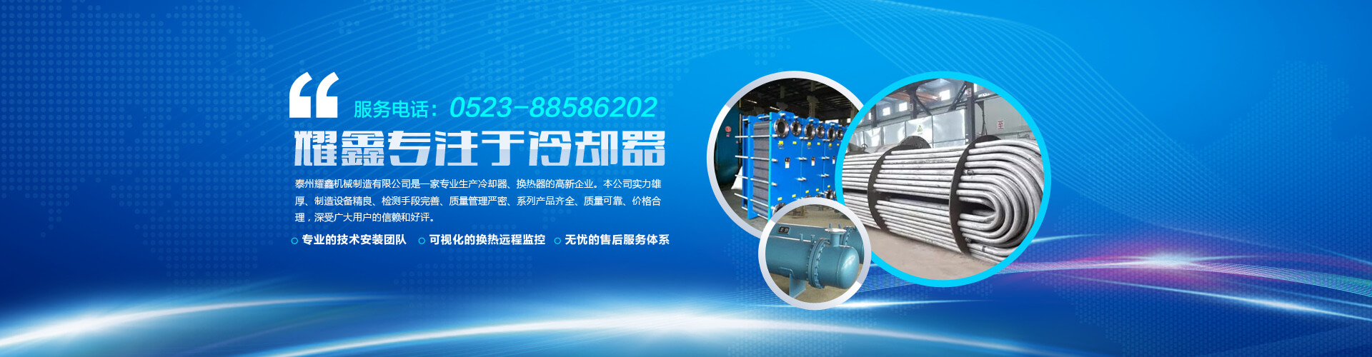 歡迎光臨泰州耀鑫機(jī)械制造有限公司官方網(wǎng)站,公司主營(yíng)風(fēng)冷卻器 油冷卻器 板式換熱器 列管式冷卻器 冷卻器
